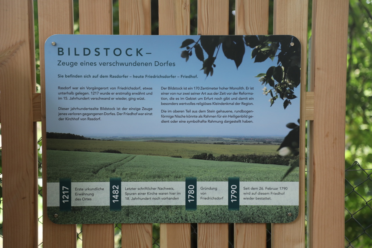 Am vergangenen Samstag, 23. August, wurde in Friedrichsdorf einem jahrhundertealten religiösen Kleindenkmal auf dem Friedhof ein würdiger Platz eingeräumt. Genauer gesagt: Ein Bildstock aus der Zeit vor der Reformation, steht dort wohl seit Jahrhunderten, allerdings führte er in den vergangenen Jahrzehnten ein Schattendasein. Jetzt wurde das Umfeld attraktiv gestaltet: Eine Rückwand aus Holz hebt den unscheinbaren Monolith hervor, eine Tafel informiert über die Geschichte. Mit einer Andacht und anschließender Feier wurde dem kleinen Denkmal die Aufmerksamkeit zuteil, die es verdient, denn es ist eines von nur zwei seiner Art im Umkreis Thüringens aus vorreformatorischer Zeit.