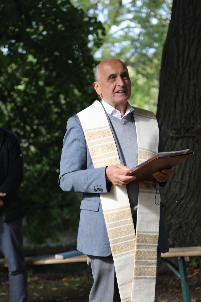 „Traditionen sind wie Laternenpfähle. Sie leuchten in der Dunkelheit, um Menschen den richtigen und sicheren Weg zu weisen. Nur Besoffene hängen sich daran auf.“, zitierte Pfarrer Johannes Preiß in seiner Ansprache eine Spruchkarte. Und tatsächlich sind Leute hier auf dem Friedhof von Friedrichsdorf zusammengekommen, nicht, um den alten Stein mit formelhaften Sprüchen, geheimen Ritualen oder schamanenhaften Tänzen zu ehren, sondern sich von diesem alten Stein wie von einer Laterne führen zu lassen, um den rechten Weg zu gehen“, führte er weiter aus: Dieser unscheinbare, schief stehende Stein war für die Menschen in vergangener Zeit von großer Bedeutung. Auch kündet er vom gelebten Glauben unserer Vorfahren. Wieviel Stürme, Kriege und Verwüstung hat dieser Stein wohl gesehen?“