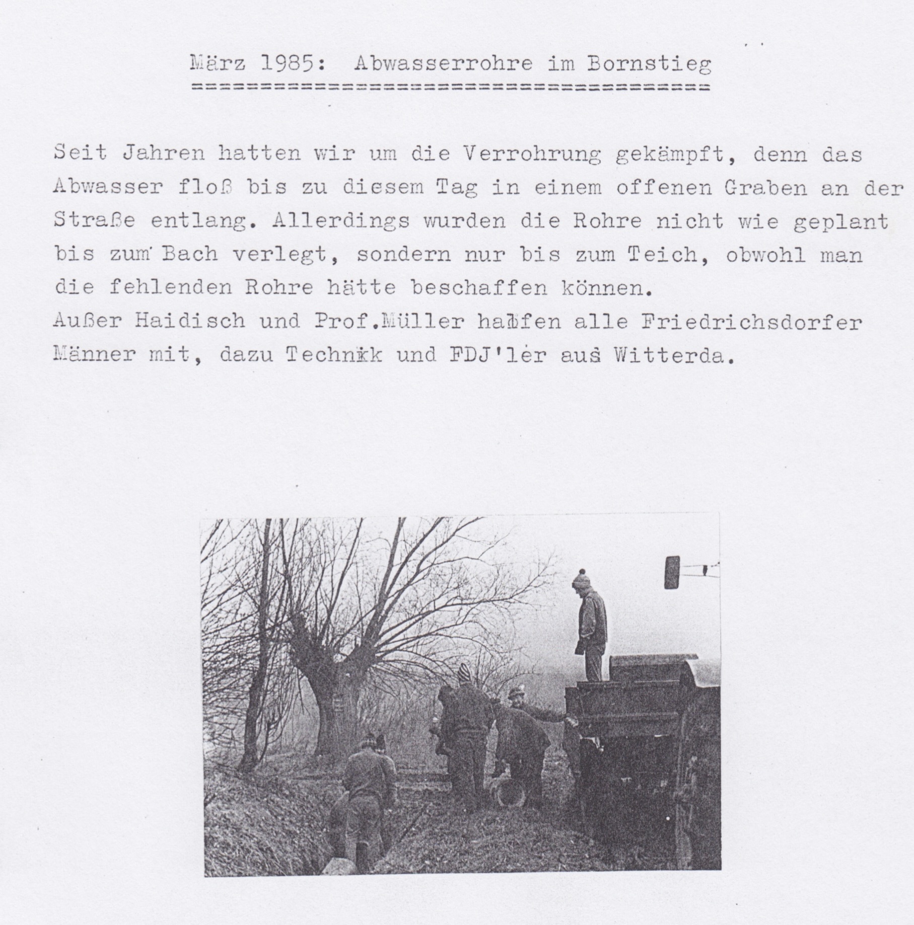 „Bis zum 29. Jahrestag der DDR sollen alle Haushalte angeschlossen sein. Und wenn man sieht, mit welchem Elan alle Bürger Friedrichsdorfs die notwendigen Arbeiten in Angriff nehmen, dann erscheint der Termin nicht utopisch, auch wenn bis zum 25.9. erst die Hälfte der Haushalte angeschlossen war.“, heißt es in einem 1978 veröffentlichten Zeitungsartikel.