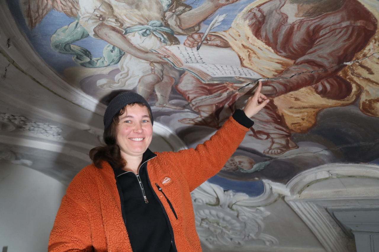 Restauratorin Marie Graubner zeigt die Risse und Beschädigungen, die behoben werden müssen.