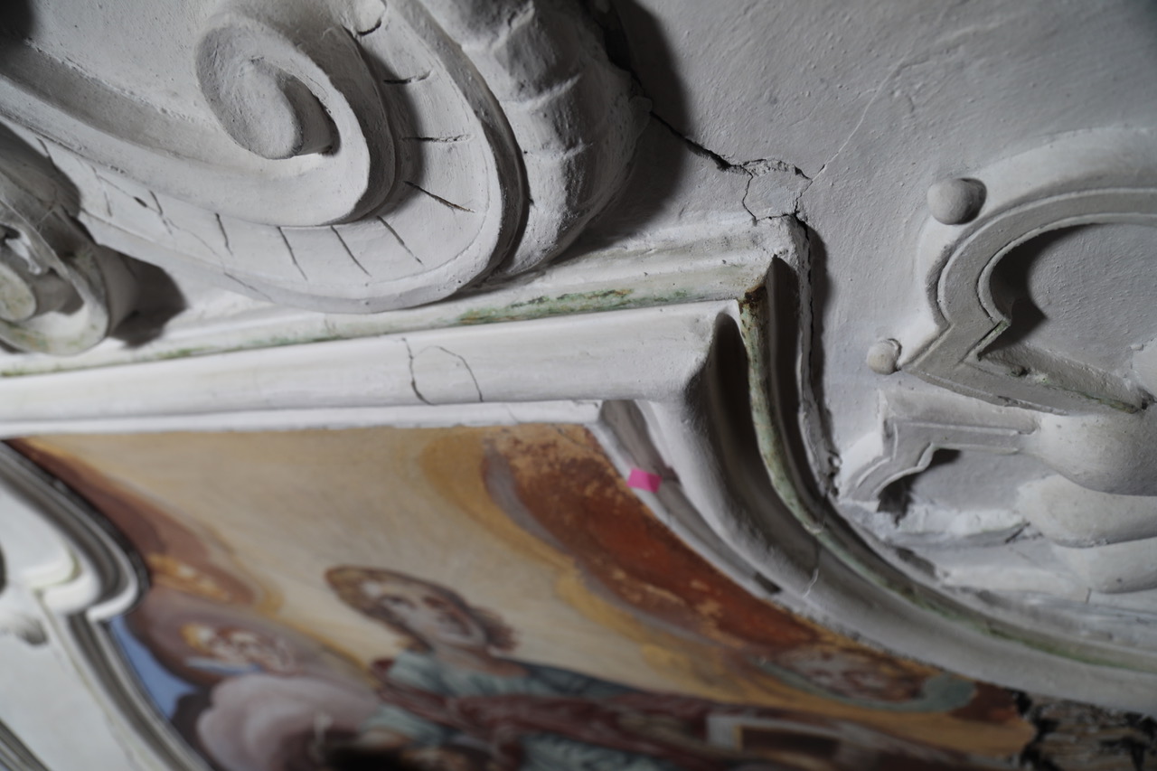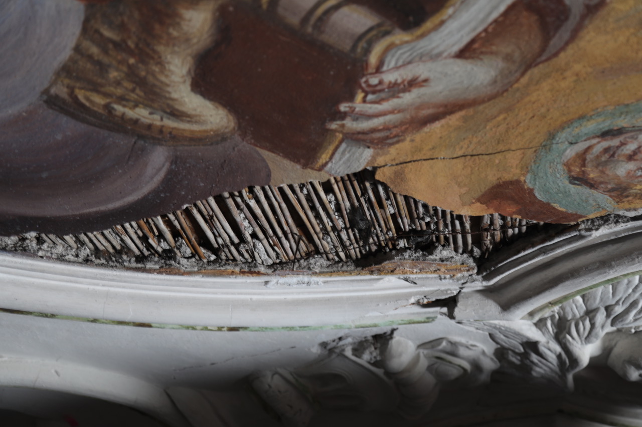 Der Träger der Decke ist eine Holztonne, mit Schilfrohr bespannt, das den Putz trägt. Dieser Malereiputz weist Risse auf, hängt an manchen Stellen durch, weil er sich vom Schilfrohr gelöst hat. Fehlstellen und Risse werden mit Vlies kaschiert und mit Stempeln gestützt. Flüssigmörtel wird hinterspritzt, wo die Decke durchhängt. Der Mörtel braucht zum Abbinden Zeit und Wärme. Von außen wird dann ein Kalkmörtel aufgetragen und neu bemalt. Wo keine Hinterfüllung möglich ist, werden kleine Edelstahlanker gesetzt, die den Putz fixieren. Diese verschwinden dann optisch im Putz.