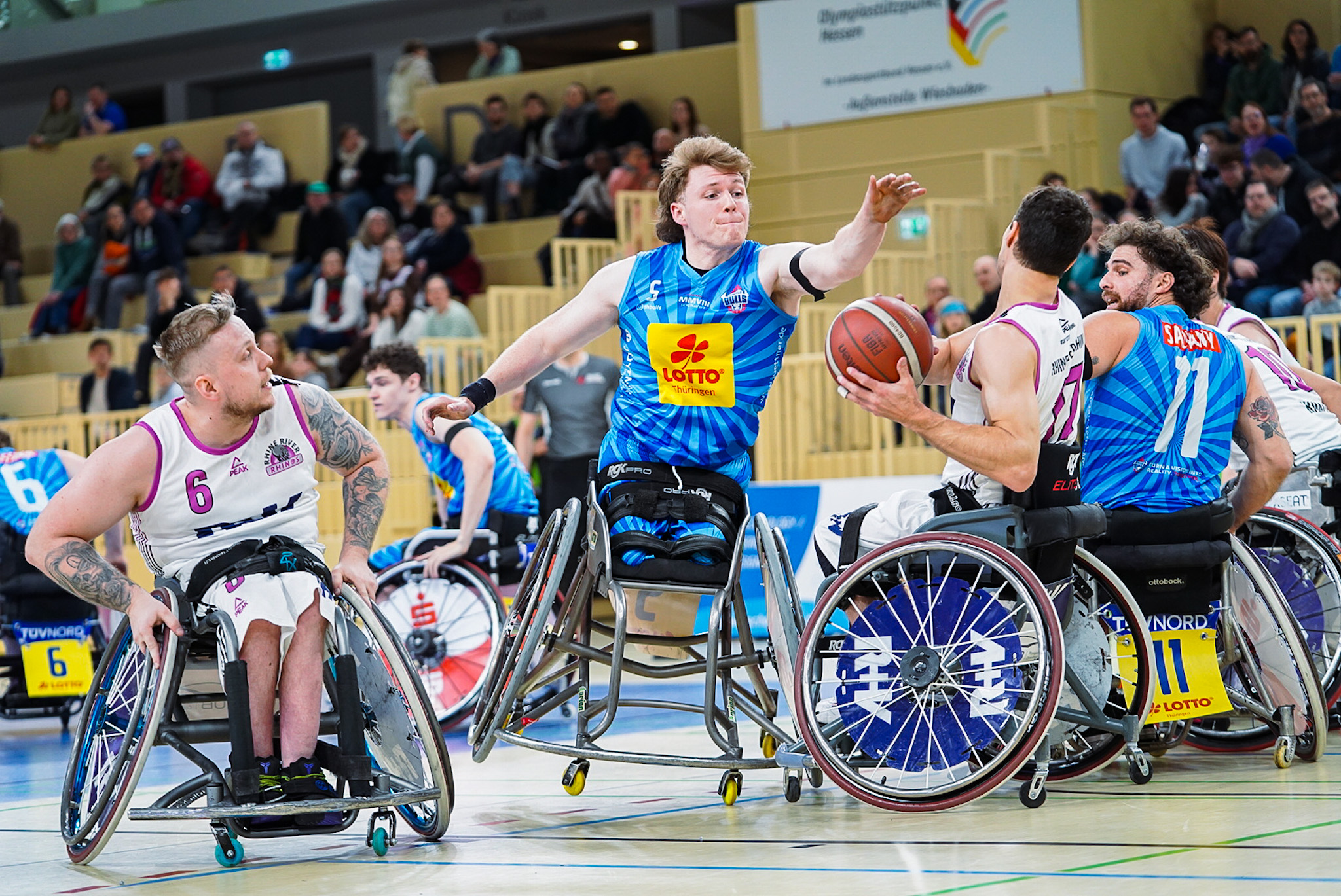 Der Start in den zweiten Abschnitt gehörte den Hausherren. Nach einem Buzzer von Dreimüller und einem Korbleger von Neuzugang Furusawa erspielten sie sich eine 18:13-Führung (13. Minute). Diese zwang Head Coach Bienek zur Auszeit, die Wirkung zeigte. Sein Team drehte die Partie und übernahm beim 19:18 (15. Minute) wieder die Führung. Es war kein Spiel für Feinschmecker, sondern für Liebhaber von robustem Rollstuhlbasketball. Die vielen zweiten Wurfchancen hielten die Rhinos im Spiel, die vor allem Mojtaba Kamali konsequent ausnutzte. Mit der Schlusssirene verkürzte er auf den Halbzeitstand von 25:23.