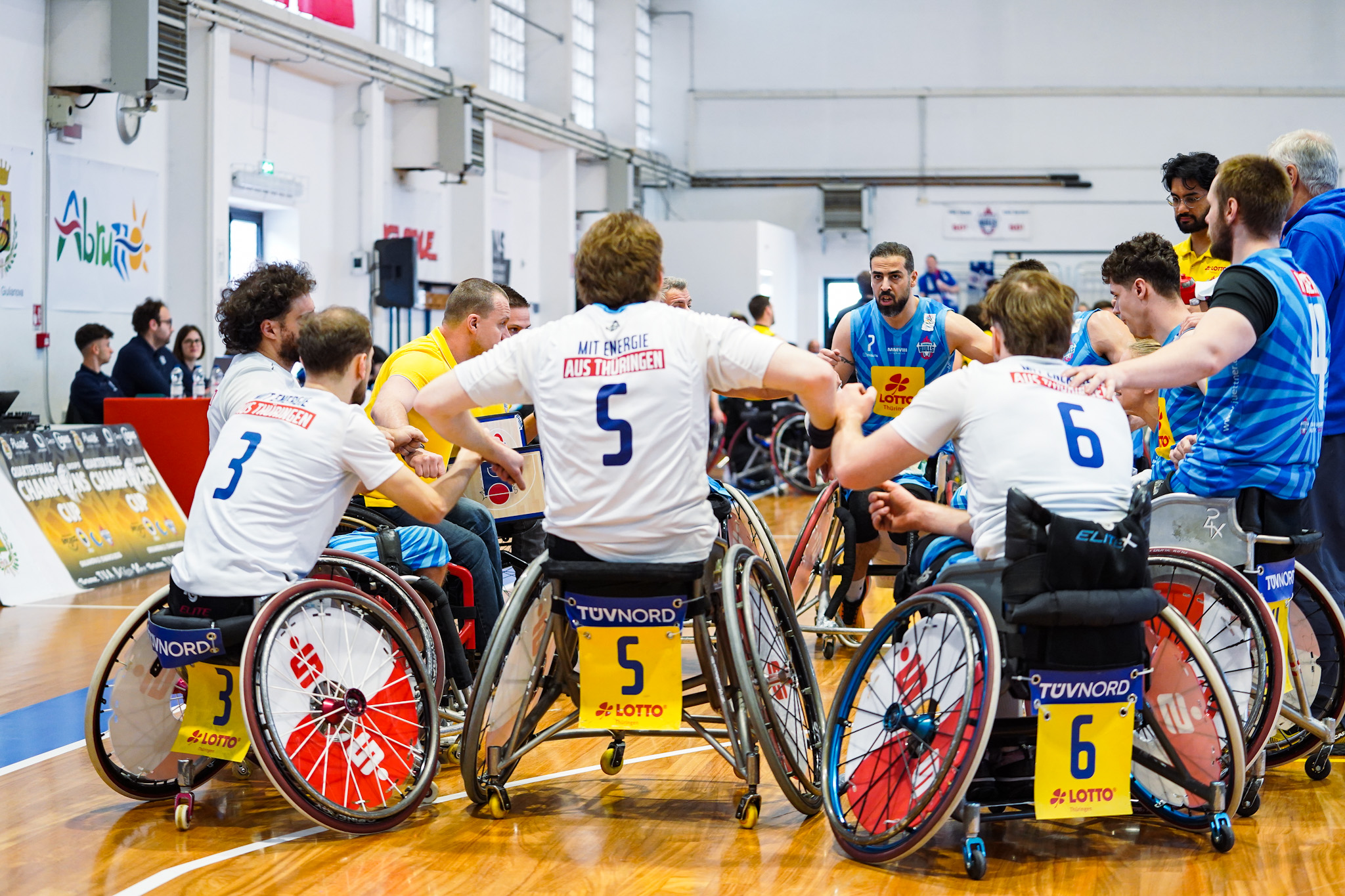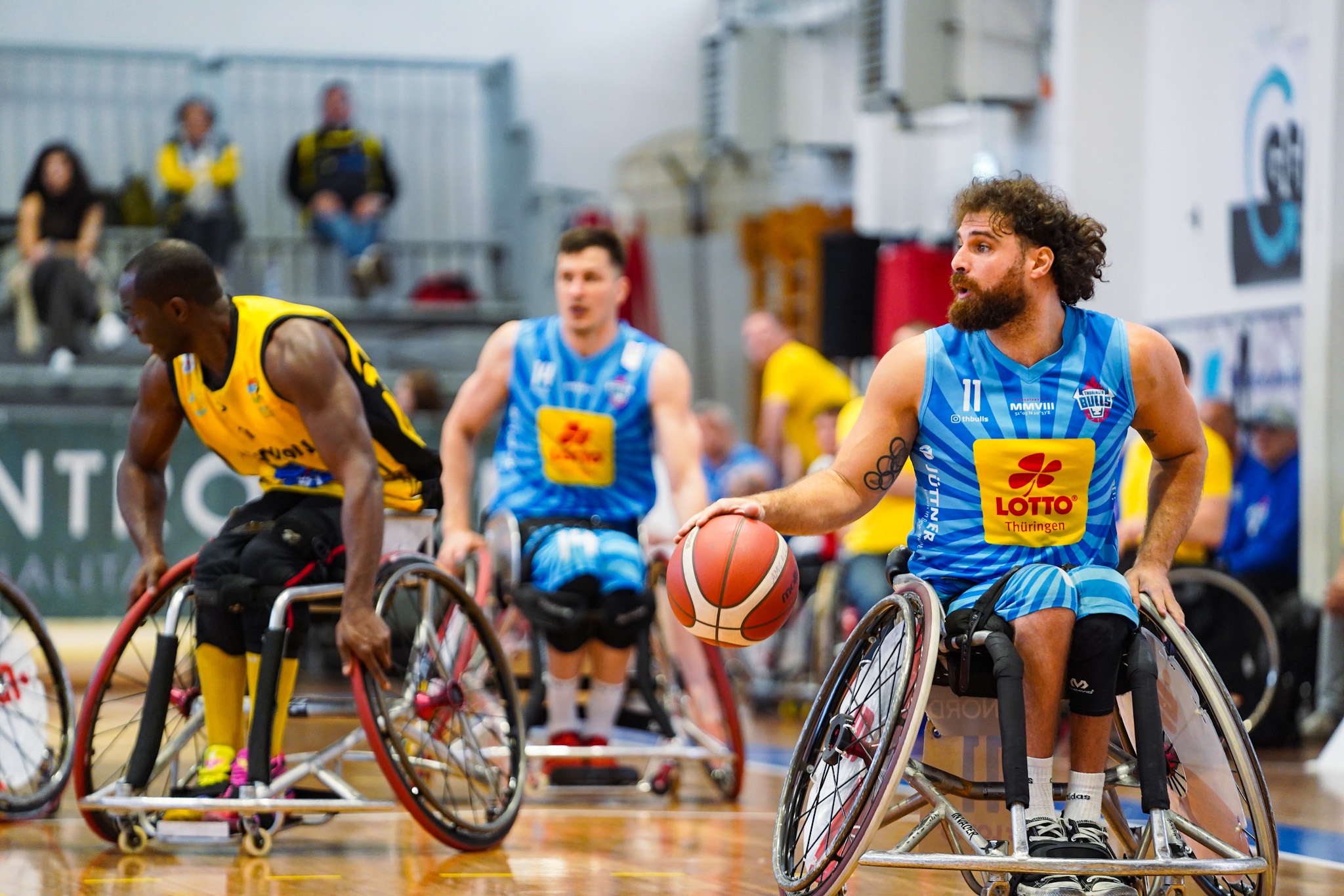 Die RSB Thuringia Bulls gewinnen in einer unterhaltsamen Begegnung gegen CD Ilunion Madrid mit 103:90 (34:25, 25:16, 26:21, 18:28) und werden damit Gruppenerster in der Champions Cup Viertelfinalrunde in Giulianova. In der Partie des Viertelfinalturniers wartete mit dem ebenfalls ungeschlagenen CD Ilunion Madrid. Die Ausgangslage war klar: Der Sieger sichert sich Platz eins in der Gruppe, der Verlierer beendet sie auf Rang zwei.