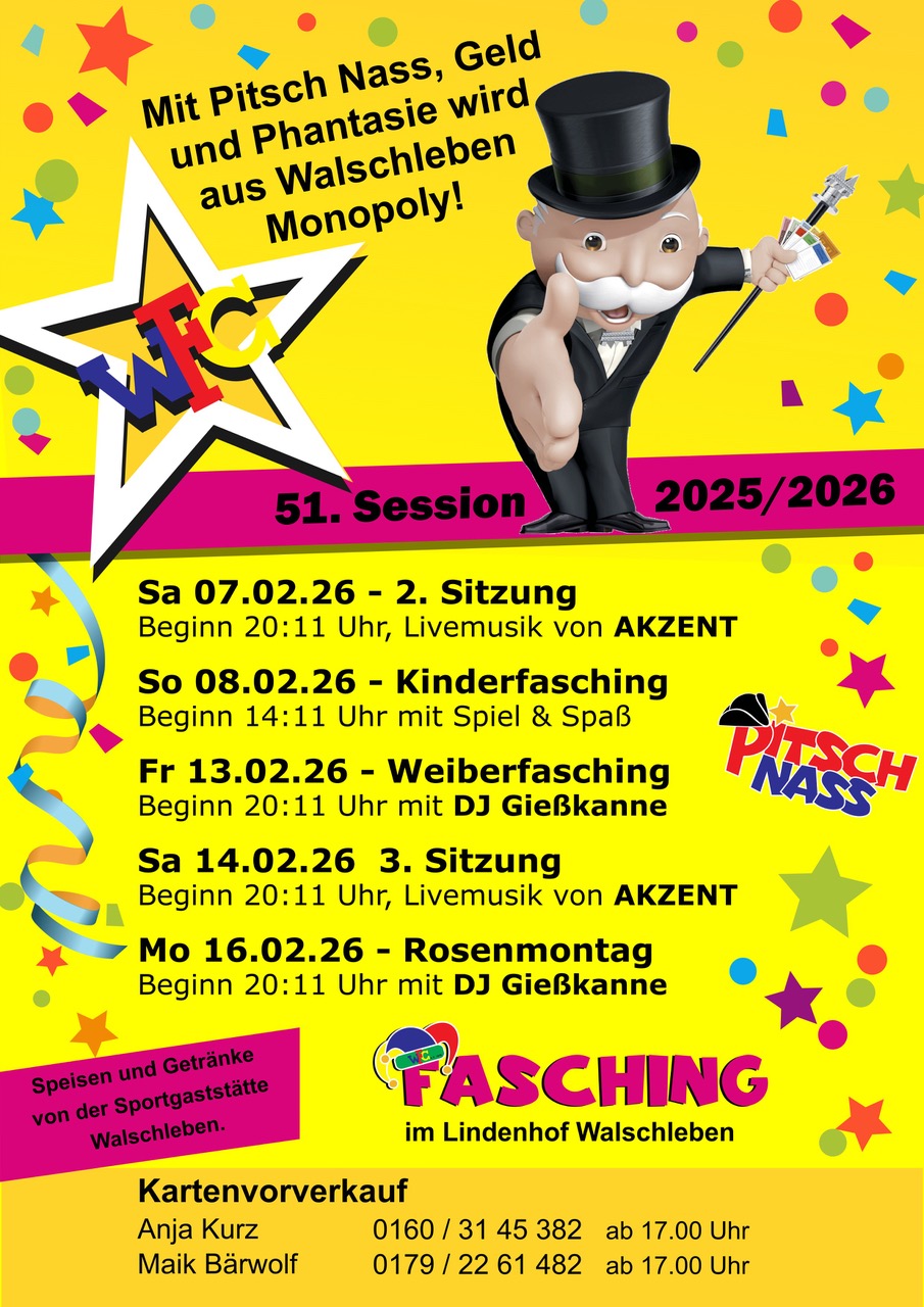Nach dem ereignisreichen 50. Jubiläum des Walschlebener Faschings der vergangenen Saison 2024/25, startete der WFC im November bereits sein neues Programm. Unter dem Motto „Mit Pitsch Nass, Geld und Phantasie wird aus Walschleben Monopoly.“ – erwartete das Publikum ein buntes Programm rund um einen klassischen Spieleabend, mit allem, was dazugehört.